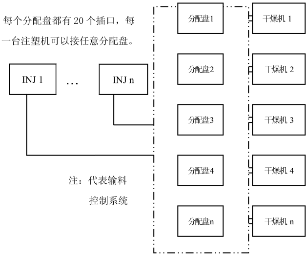 工厂所用的塑料粒子一般有两大类,PP(聚丙烯)和 PA(聚酰胺)。根据烘料温度和烘料时间的不同,还可以细分为数百到数千种。在实际的生产过程中,一台干燥机往往具有通用性,能对很多种塑料粒子进行烘干处理。因此工厂里的干燥机数量往往少于注塑机的数量,这就使得多台注塑机需要一台干燥机同时供料。另外,由于某些塑料粒子的特殊要求,以及节约成本和能源的考虑,这些塑料粒子只能在固定的干燥机上进行烘干处理。在实际生产过程中,只能由单台干燥机对注塑机进行供料。